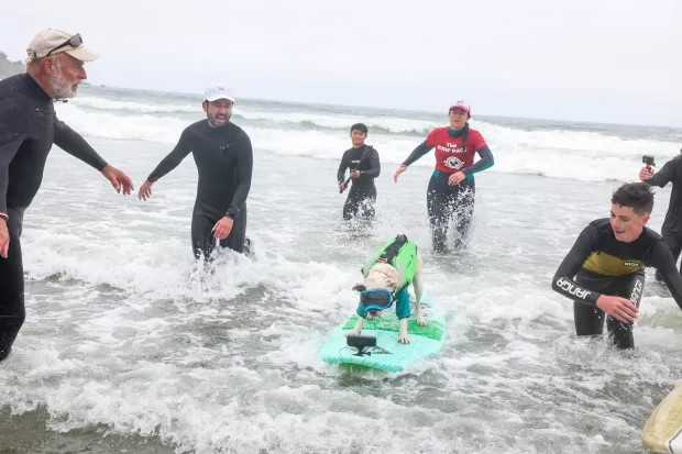 1. Сотни зрителей наблюдают за участниками ежегодного чемпионата мира по сёрфингу среди собак на пляже Линда Мар в Пасифике, Калифорния, в субботу, 2 августа 2025 года.