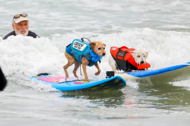 11. Кокос (слева) из Берлингейма и Собака-сёрфингист Иза из Плезантона катаются на доске во время ежегодного чемпионата мира по сёрфингу среди собак